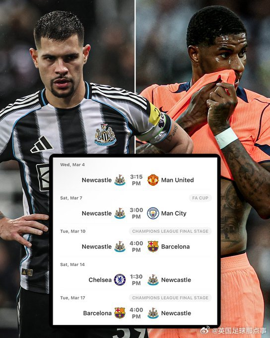 纽卡3月迎魔鬼赛程,连战曼联曼城巴萨切尔西 英国足球那点事 优质体育领域创作者 02.2810:53 关注 💀纽卡3月份迎来魔鬼赛程.....主场vs曼联(英超)主场vs曼城(足总杯)主场vs巴萨(欧冠)客场vs切尔西(英超)客场vs巴萨(欧冠)