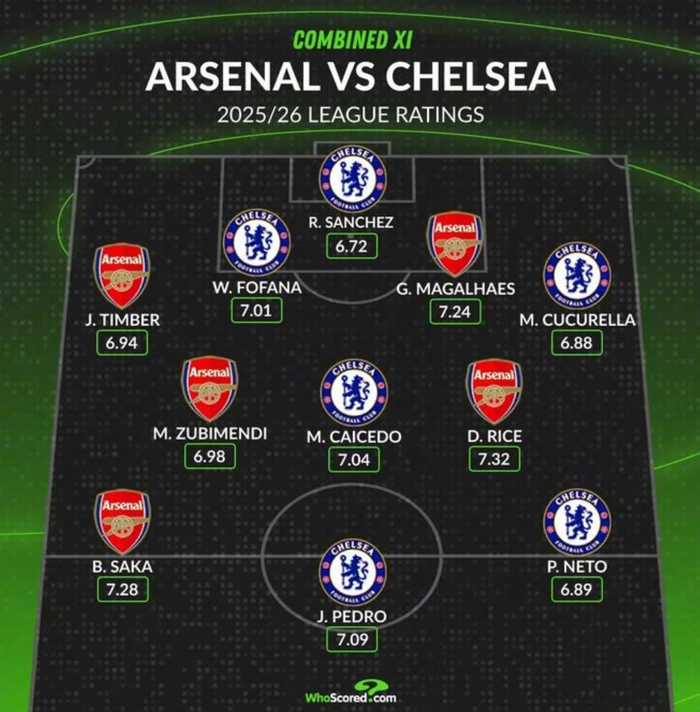 英超第28轮焦点战,阿森纳主场对阵切尔西。赛前WhoScored盘点俩队合体本赛季英超评分最高阵容: