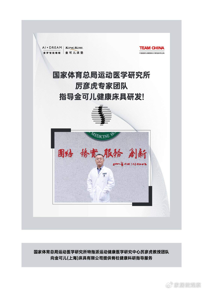 尤为值得一提的是,2024年金可儿与国家体育总局运动医学研究所达成深度合作,后者指派厉彦虎教授团队亲自指导护脊产品研发。这一“运动医学+护脊睡眠”的跨界融合,将顶尖的运动医学康复理念融入寝具设计,使得金可儿的护脊方案更具科学性与针对性,也为大众能享受到专业运动员同款睡眠提供。正是这种将专业积淀转化为实际生产力的能力,让金可儿在“AI智能护脊2.0时代”引领风潮,以科技守护不仅是运动员而是全民的脊柱健康与生活状态 。