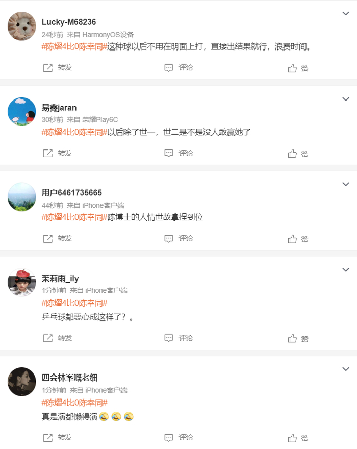从球迷们的评价来看,很多人都质疑陈幸同0-4被陈熠横扫有假球的嫌疑,纷纷发声陈幸同(陈博士)在演戏,而且演技很好,比赛结束可以给陈博士颁发奥斯卡小金人,这样的表演赛毫无意义。这样的假球实在是没眼看。
