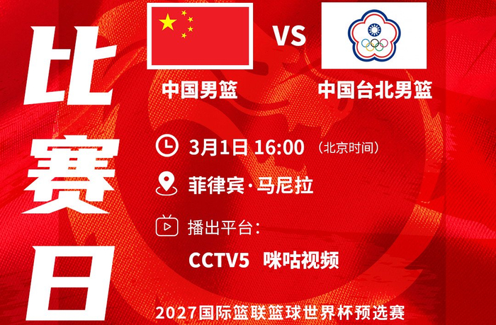 北京时间3月1日(今日)下午16时,2027年国际篮联(FIBA)篮球世界杯预选赛第二窗口期的一场焦点对决中,中国男篮国家队对阵省队中国台北男篮,比赛安排在菲律宾的马尼拉进行。同组的另一场比赛中,小日本男篮对决韩国男篮。