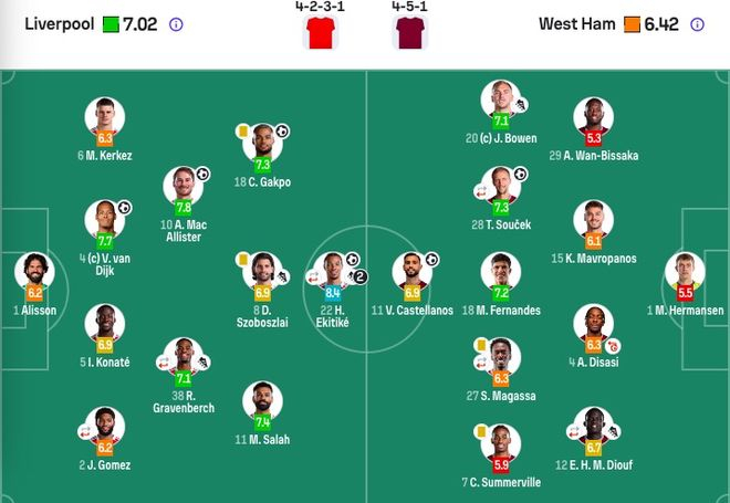 利物浦首发:1-阿利松、2-戈麦斯(76'30-弗林蓬)、4-范戴克、5-科纳特、6-凯尔凯兹、8-索博斯洛伊、10-麦卡利斯特、38-赫拉芬贝赫(85'42-尼奥尼)、11-萨拉赫、18-加克波、22-埃基蒂克(76'73-恩古莫哈)