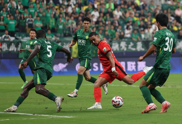 2025年9月21日,上海海港队球员莱昂纳多(右二)在比赛中射门得分。 当日,在北京工人体育场举行的2025赛季中国足球超级联赛第25轮比赛中,北京国安队主场2比3不敌上海海港队。 新华社记者 胡星宇 摄