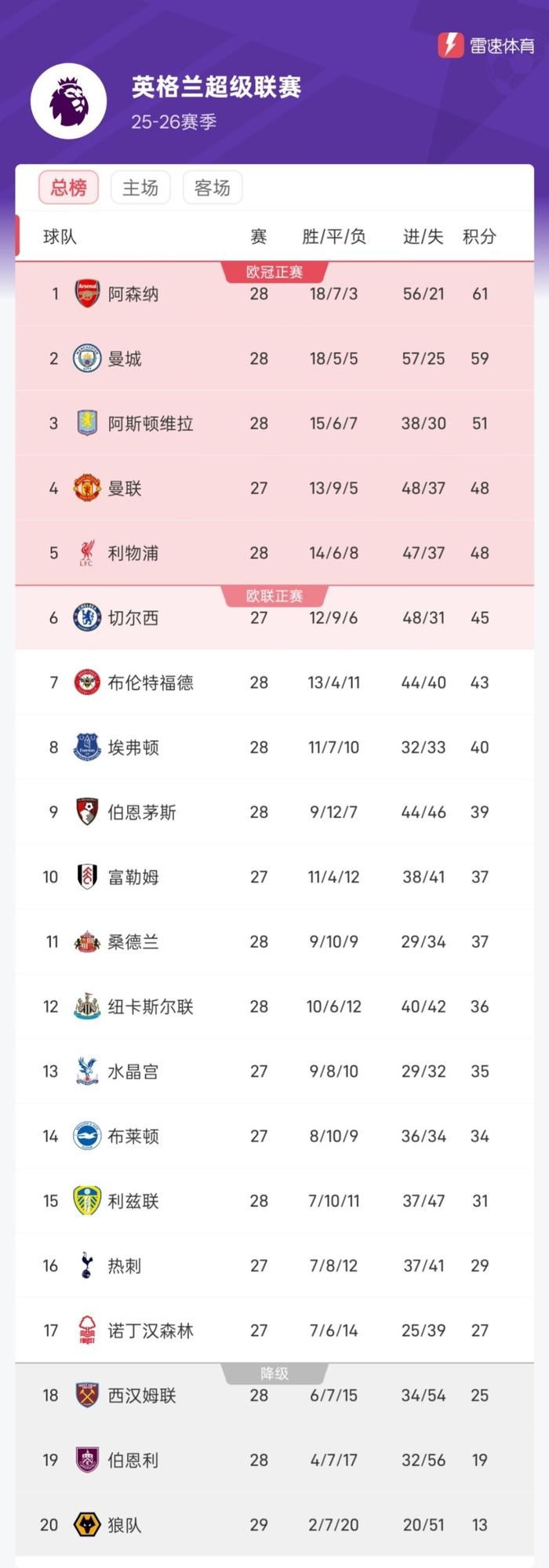 纵观积分榜,曼城仍落后榜首阿森纳2分,曼联少赛一场位列第4。热刺、森林仍陷入保级泥潭。