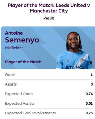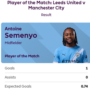72%得票率,塞梅尼奥当选利兹联vs曼城球迷票选全场最佳