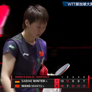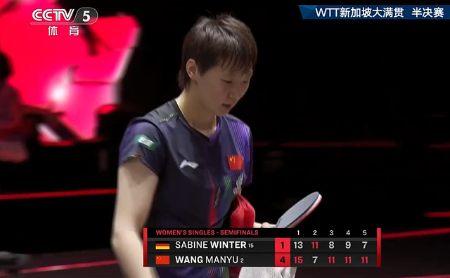 面对温特,王曼昱一上来陷入了苦战,第一局打到15-13艰难险胜,随后第二局被温特11-7扳平大比分。第三局,王曼昱11-8再胜,随后第四局面对开局1-8落后的局面之下,最后完成大逆转,将总比分扩大到3-1。第五局,王曼昱继续不给机会,11-7再胜,总比分4-1淘汰温特,昂首挺进决赛。