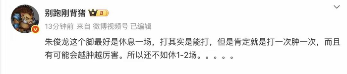 而有消息称,假如朱俊龙想要坚持出场,也是可以的但是需要完成超声波消肿、肌效贴固定、止痛针注射等紧急处理,但是这样的操作会让他的脚踝带来不可逆的影响。同样有多位媒体人表示,他应该休息1-2场,对此,您是怎么认为的呢?您认为朱俊龙应该带伤出战第二场的对决么?