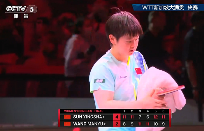 第五局,双方多次打平,孙颖莎10-7领先情况下被王曼昱连追2分,最后还是12-10获胜,总比分3-1领先。第六局,比分2-2打平之后,孙颖莎逐渐拉开分差,9-3领先,王曼昱追到9-10,还是追分失败,总比分2-4输球,目送孙颖莎完成卫冕,同时收获赛季第2冠。