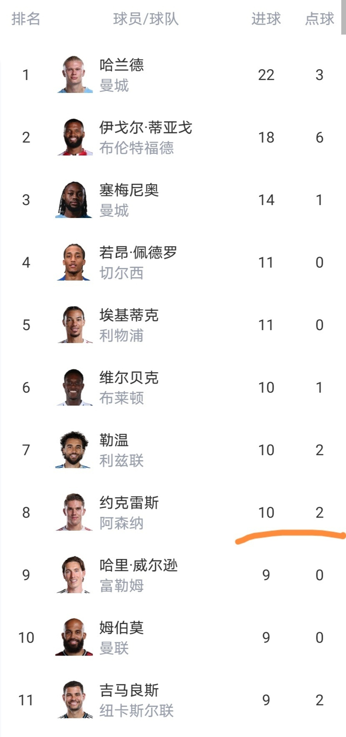 射手榜蒂亚戈、哈兰德等8人进球上双,哈兰德以4球优势领跑,可以看到哈兰德领先优势在缩小。
