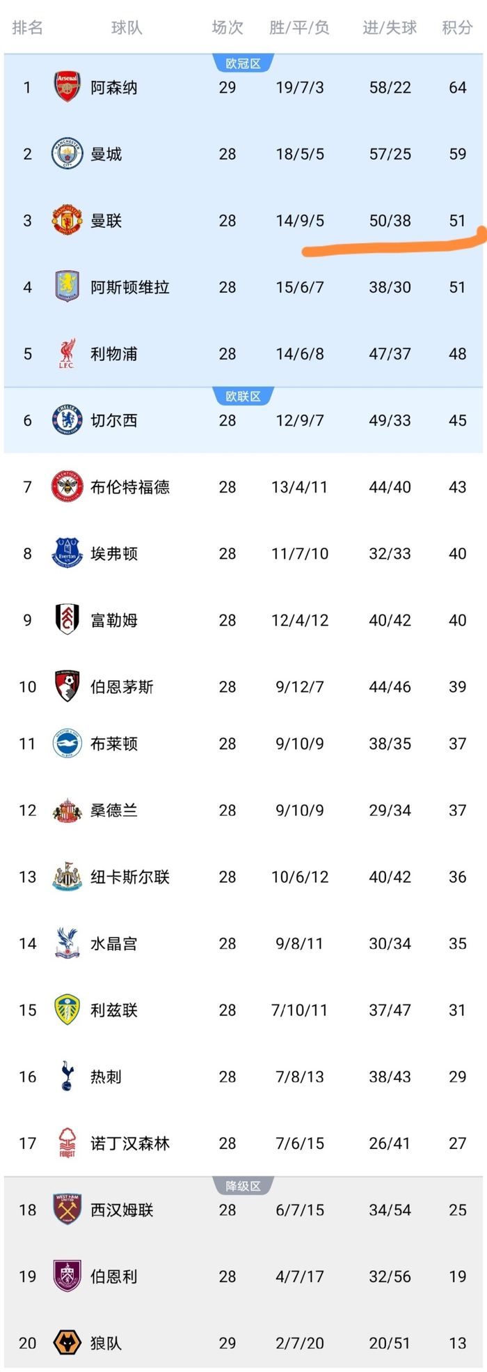可以看到阿森纳击败切尔西队之后,积分已经上涨到了64分,比曼城多赛一场的情况下,暂时领先曼城5分,而切尔西输球之后,积分停留在了45分,排名跌至第6了。热刺输球之后,积分停留在了29分,排名第16,仅领先降级区4分,热刺真的濒临降级了,热刺要小心了啊。而曼联击败水晶宫队之后,积分已经上涨到了51分,已经反超了维拉,来到了积分榜的第三位,曼联真的要崛起了,虽然曼联没有争冠的希望,但是曼联的崛起显然是球迷希望看到的事情,英超会因此更加精彩。