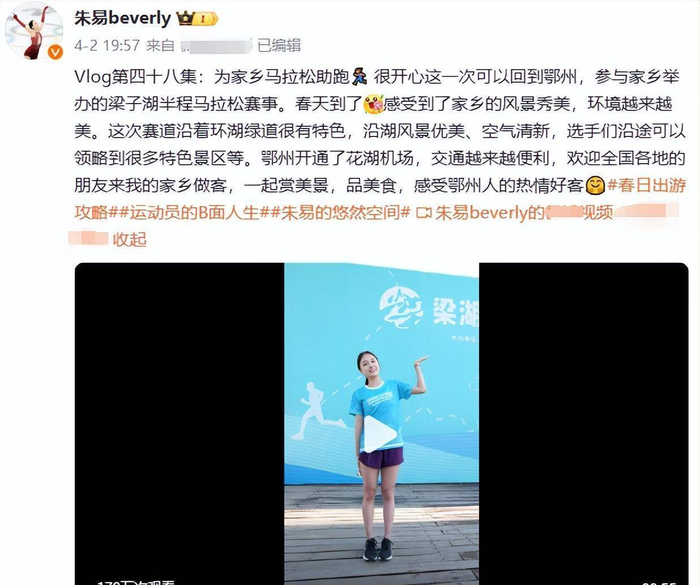 最近,朱易在社交平台上说,她帮家乡的马拉松活动跑了步。