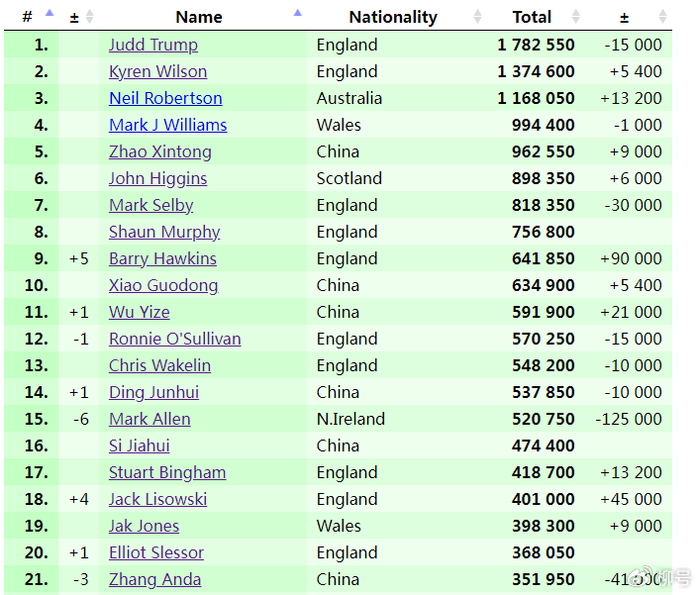 最新世界排名:丁俊晖第14,赵心童第5,特鲁姆普第1,冠军霍金斯第9