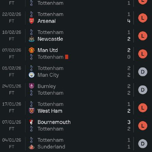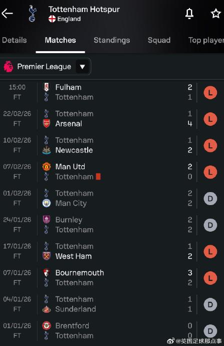 Squawka:热刺在英超联赛中已连续10场不胜(6负4平),这是自1994年奥斯瓦尔多·阿迪莱斯执教以来的首次。#富勒姆2比1热刺#