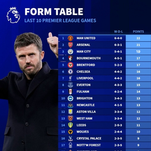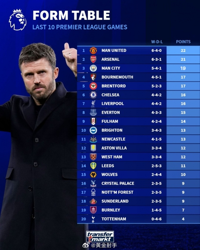 德国转会市场统计了近10场英超积分情况,曼联以22分位居榜首,阿森纳和曼城分别以21分和19分分列二三位,切尔西和利物浦均拿到16分。值得一提的是,热刺在此期间仅拿到4分成为表现最差的球队。