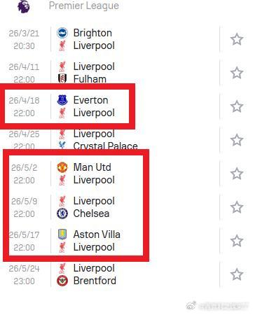 利物浦未来5场赛程