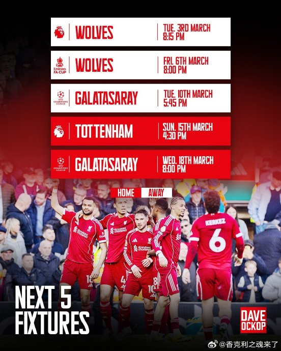 利物浦未来5场赛程公布,3月连战狼队、热刺、加拉塔萨雷