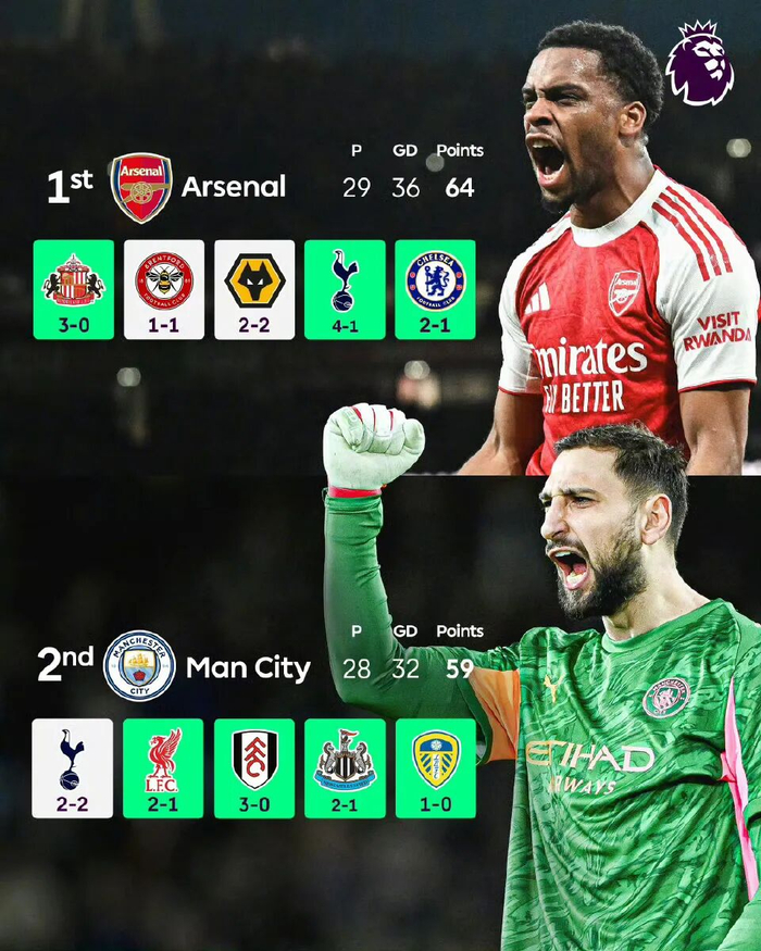 作为全欧洲表现最好的球队,阿森纳和曼城之间的争夺成为英超最亮眼的风景线。今天凌晨,阿森纳在一场“角球大战”中笑到最后,以2:1战胜同城对手切尔西,在先赛一轮的情况下保持对曼城的5分领先优势,而曼城依然在身后紧追不舍,他们近5场取得全胜,状态十分出色。在双方比赛场数相同的情况下,曼城距离阿森纳只有两分之差,因此双方在4月18日英超第33轮的直接对话极有可能决定本赛季英超冠军的最终归属。