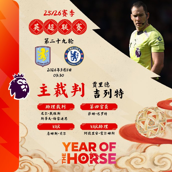 2025/26赛季英超联赛第二十九轮主裁判名单