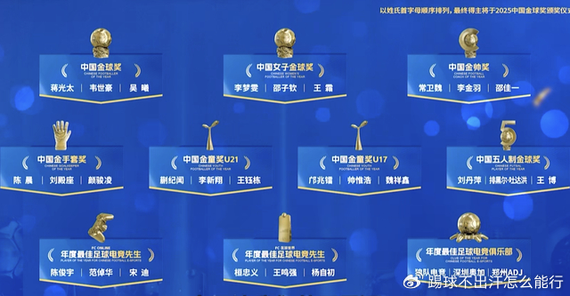 此外,五人制金球奖得主:刘丹萍,年度最佳足球电竞先生(FC 足球世界):杨自初,最佳电竞先生(FC ONLINE):范倬华,最佳电竞俱乐部:郑州ADJ。组委会特别奖:赢得亚洲杯亚军的U23国足!关于这次的中国金球奖颁奖典礼,大家有什么想说的呢?
