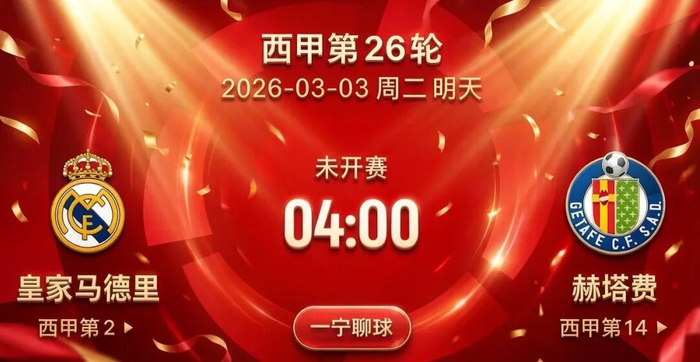 西甲:皇马vs赫塔费比赛时间 2026-03-03 04:00