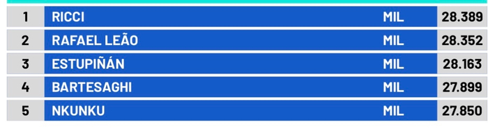 米兰客场战克雷莫纳,里奇冲刺时速28.389公里位列全队第一