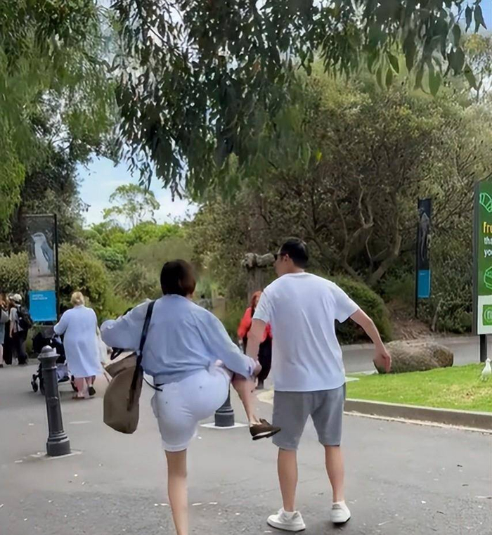 刚走在路上,他就开始玩起了。他媳妇踢了他一脚,他赶紧反应过来,立马拽住了。