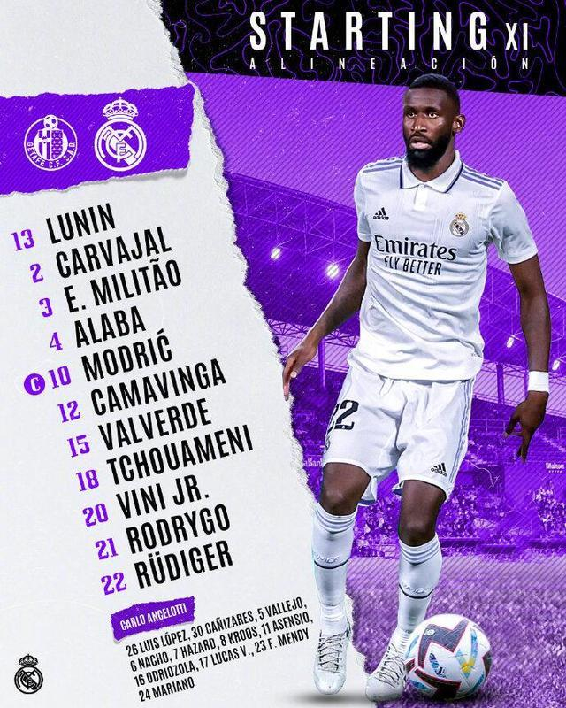 皇马vs赫塔菲首发:巴西双星先发,库尔图瓦连续缺阵