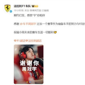 法拉利车队在中文社交媒体上深情发文:“期约已至,感恩‘宇’你相伴。感谢周冠宇过去一个赛季作为储备车手的努力与付出。祝福小周未来的赛车生涯一切顺利。”