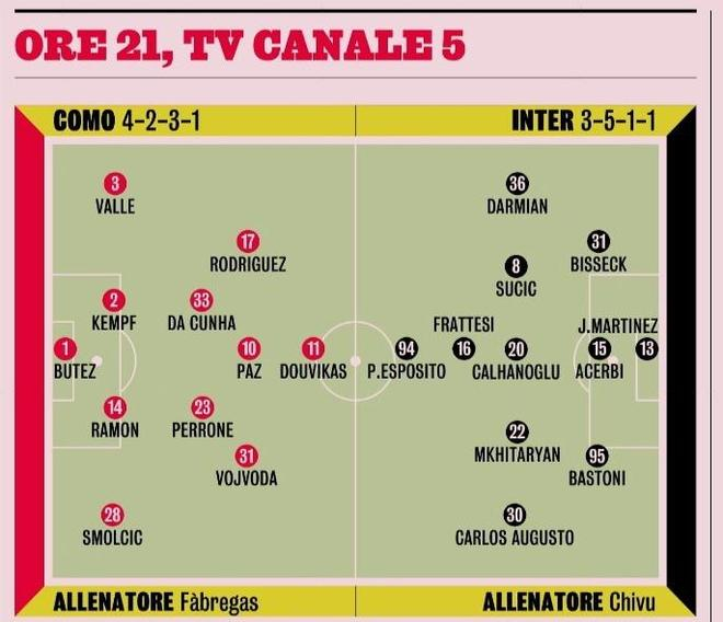 关于明天的首发阵容,天体和米体的预测基本相同,球队会进行8-9人的大范围阵容轮换。天体预测国米依然是踢352阵型,其中锋线上是小图拉姆和皮奥联袂首发,而米体则预测球队会采用3511阵型,中后场阵容不变,皮奥打单前锋,而弗拉泰西出现在其身后打一个影锋的位置。