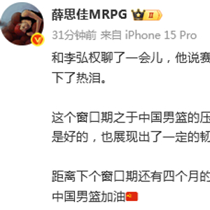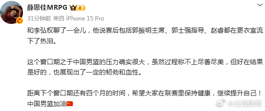 薛思佳写道:“和李弘权聊了一会儿,他说赛后包括郭振明主席、郭士强指导、赵睿都在更衣室流下了热泪。”