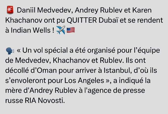 北京时间今晨,俄罗斯一家通讯社发布消息,称他们从卢布列夫的母亲口中得知,梅德维德夫、卢布列夫和卡恰诺夫三兄弟都已经离开了阿联酋的迪拜,转道阿曼,然后乘坐私人飞机逃出了战争冲突区。报道称,俄罗斯三兄弟计划先飞到土耳其的伊斯坦布尔,然后再从那里转机飞往美国的印第安维尔斯参赛。当然,赛前预热的混双表演赛,梅总和卢布是赶不上了,而且赛事组织方已经换人了,但能出战单打正赛已经是很好的结果了。