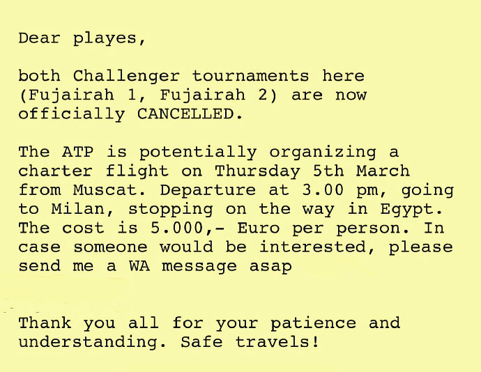 据了解,梅总他们为尽快离开险地,支付了高达数万欧元的私人飞机包机费。而有能力支付这笔费用,也是他们能提前脱离险境的原因。而其他滞留在阿联酋的球员就没有这么好的条件了,包括迪拜站和富伊查拉挑战赛的所有被困球员都被相关赛事组织方告知,他们可以在3月5日乘坐包机飞往意大利的米兰,但是需要每人支付5000欧元的包机费。