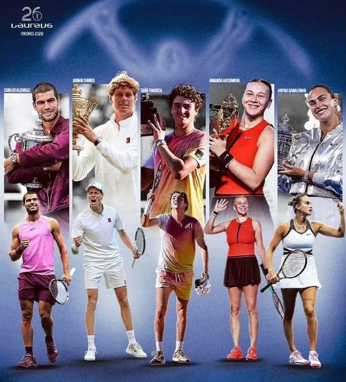 我们再来关注劳伦斯世界体育奖。北京时间昨晚,2026年劳伦斯体育奖官方公布了四个奖项的提名球员名单。年度最佳男运动员:阿尔卡拉斯、辛纳;年度最佳女运动员:萨巴伦卡;年度最佳突破奖:丰塞卡;年度最佳复出奖:阿尼西莫娃。