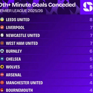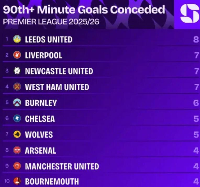 2025/26赛季英超补时丢球榜,利兹联8次居首 虎扑足球 虎扑足球官方账号 03.0417:00 关注 在2025/26赛季英超中,多支球队已经多次在90分钟以后丢球。其中,利兹联以8次排名第一,是本赛季补时阶段丢球最多的球队。利物浦、纽卡斯尔联和西汉姆联均丢了7球,并列第二。