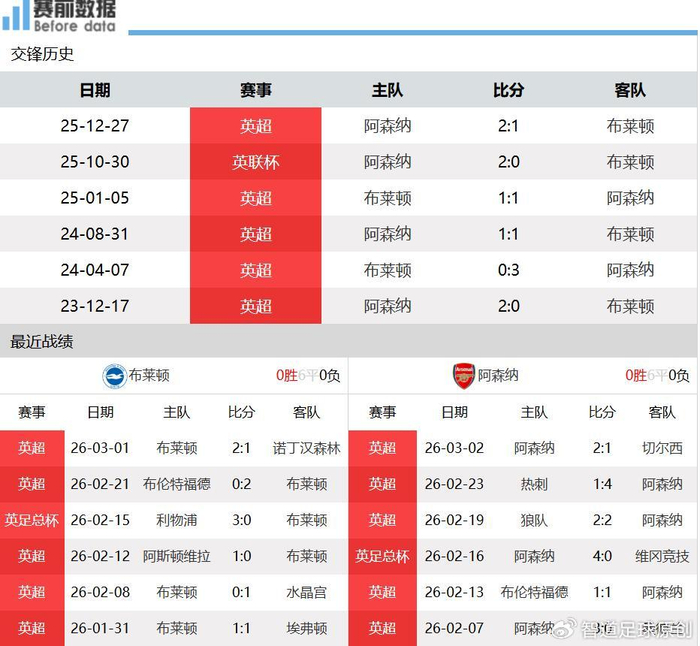 北京时间3月5日凌晨03:30,英超第29轮,布莱顿主场迎战阿森纳。