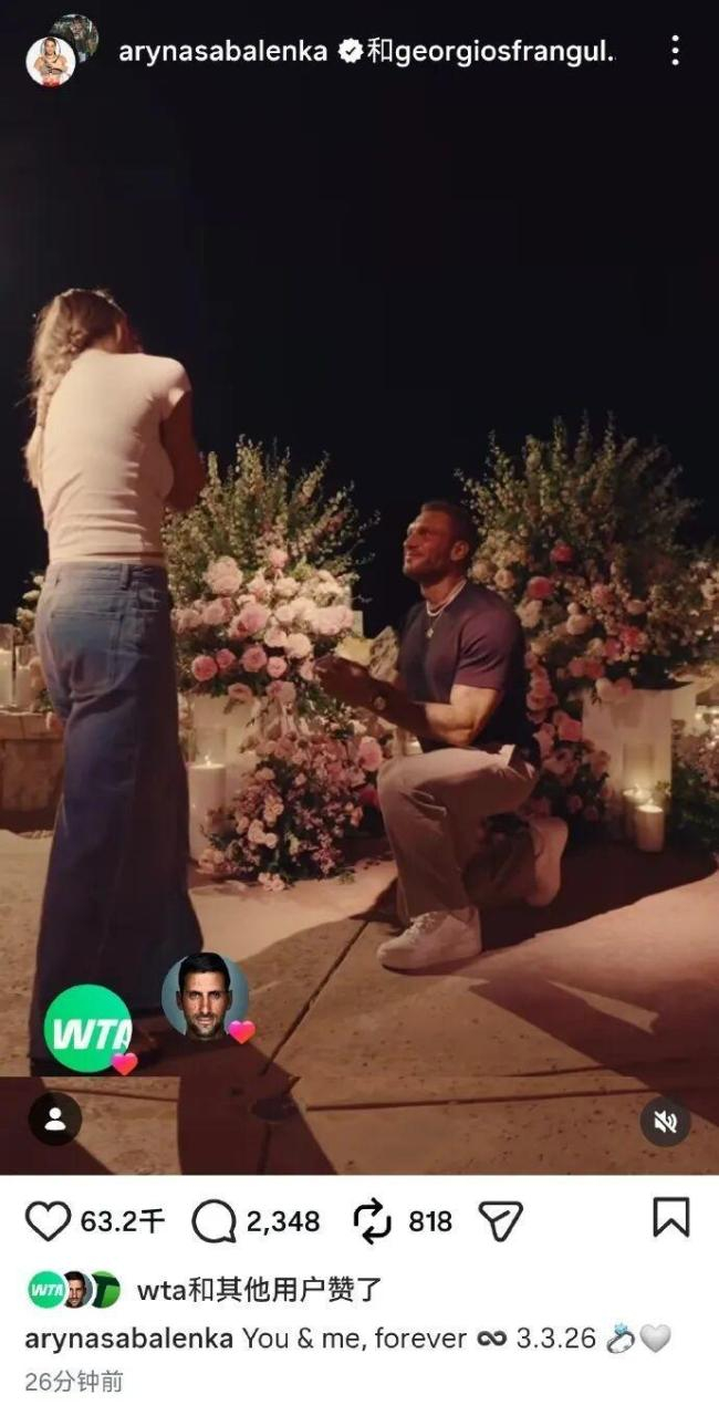 3月4日,女子网球的世界排名第一选手萨巴伦卡宣布了订婚的消息。视频中,男友弗兰古利斯单膝跪下求婚,虽然萨巴伦卡背对镜头,但从她的背影可以看出她非常开心。