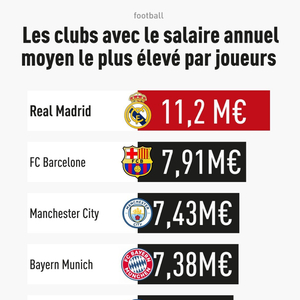 排在前三名之后的是拜仁慕尼黑(738万欧元),其次是巴黎圣日耳曼和阿森纳,两者的平均年薪都在700万欧元左右。接下来是四家英超球队,包括利物浦和曼联(约600万欧元),然后是切尔西和托特纳姆热刺(约450万欧元)。前十名中没有意大利俱乐部。