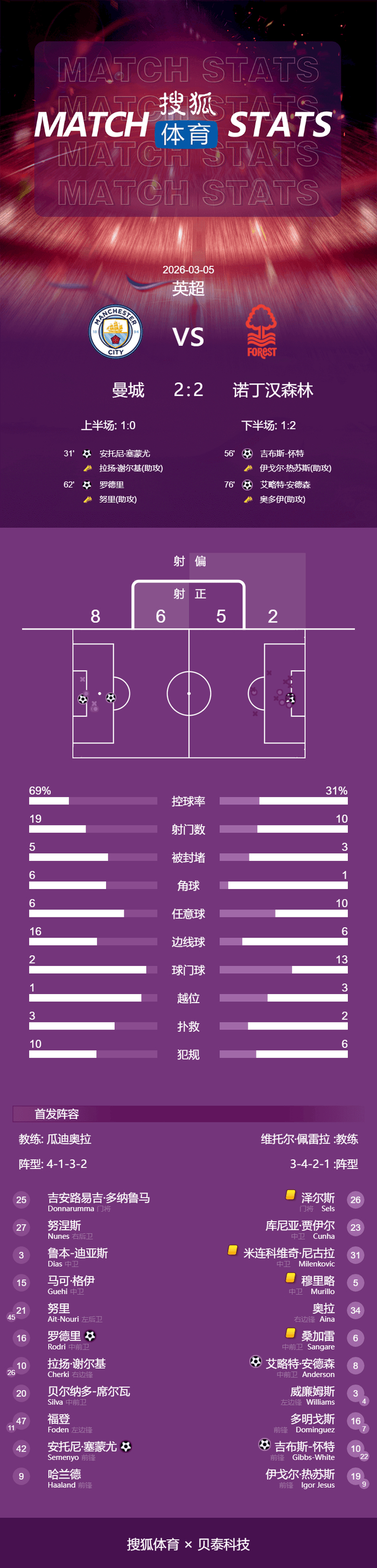 第71分钟,谢尔基直塞,哈兰德前插禁区内和门将接触后倒地,主裁判没有判罚。第77分钟,奥多伊做球,安德森禁区外远射轰入死角,森林2-2。