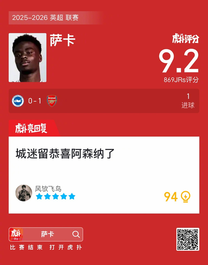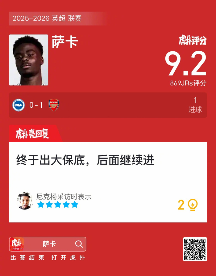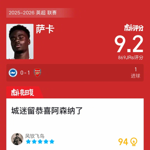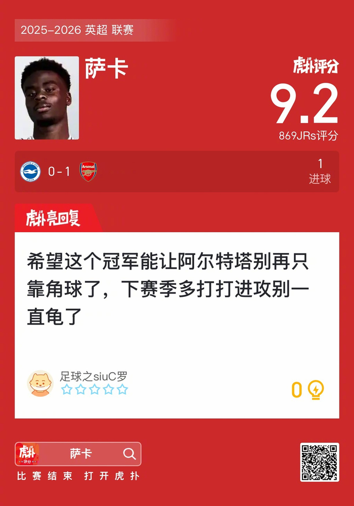 #布莱顿0比1阿森纳#萨卡打进一球,这表现你给几分?