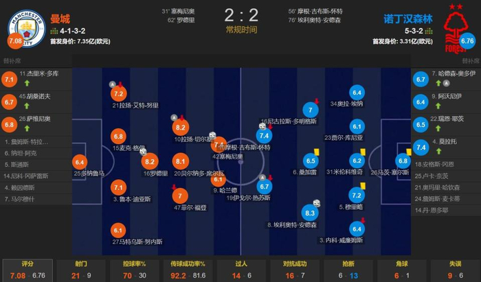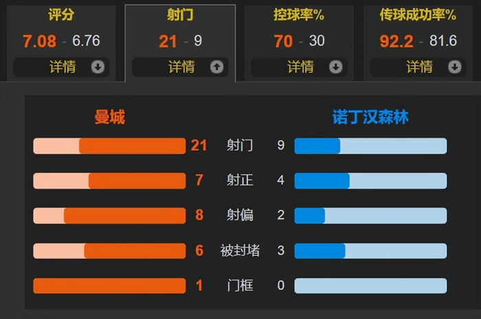 全场比赛,曼城的控球率为70%,狂射21脚,其中仅有7次射正;诺丁汉森林9次射门,其中4次射正。