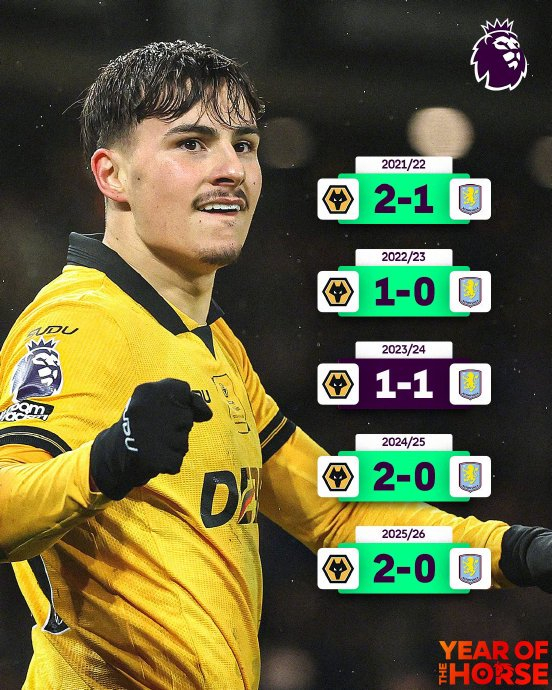 - 2-0零封阿斯顿维拉:全程压制联赛第四的维拉,凭借高效反击与稳固防守完胜对手,终结了维拉主场24战仅1败的强势纪录。
