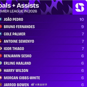 2026英超参与进球榜,若昂·佩德罗10球领跑