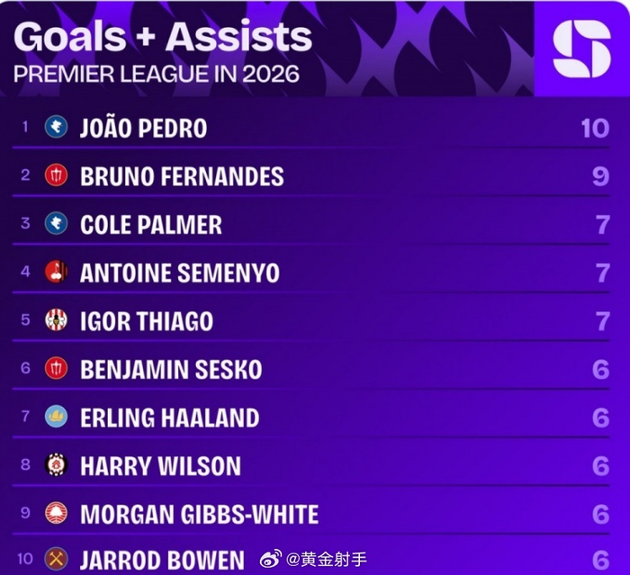 #曼城[超话]# Squawka统计了2026年球员在英超的参与进球数量,并列出榜单,若昂·佩德罗参与10球居首,B费参与9球次席。