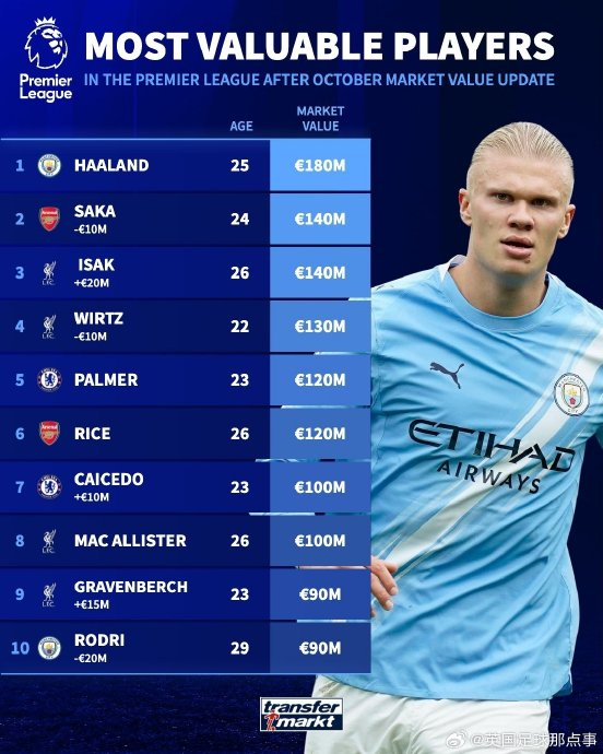 英超作为全球商业价值最高的足球联赛,汇聚了众多顶尖球星,目前除阿森纳的萨卡(1.3亿欧元)外,还有7名球员身价突破1亿欧元大关,他们分别来自曼城、利物浦、阿森纳和切尔西,共同构成了联赛的“亿元俱乐部”。