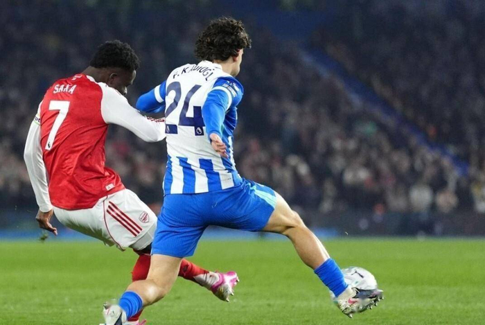 开场第3分钟,门将拉亚就出现了一次低级失误,出球被断,差点让布莱顿前锋巴莱巴吊射空门得手,幸亏中卫加布里埃尔在门线上极限解围。逃过一劫的阿森纳迅速稳住阵脚。第9分钟,他们的王牌萨卡站了出来。在右路接到传球后,萨卡带球内切,横向盘带两步,突然起左脚兜射远角。皮球打在防守球员身上有一个轻微的变线,让布莱顿门将判断失误,只能眼睁睁看着球入网。