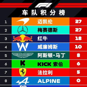 直播吧3月17日讯 2025F1澳大利亚大奖赛赛后车队积分榜更新,迈凯伦和梅赛德斯同获27分,红牛18分排第三,威廉姆斯10分,阿斯顿-马丁8分,索伯6分,法拉利5分,ALPINE、红牛二队喝哈斯未能获得积分。