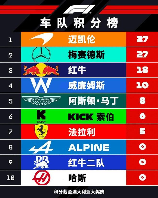F1澳大利亚大奖赛赛后车队积分榜:迈凯伦和梅赛德斯同27分居前二