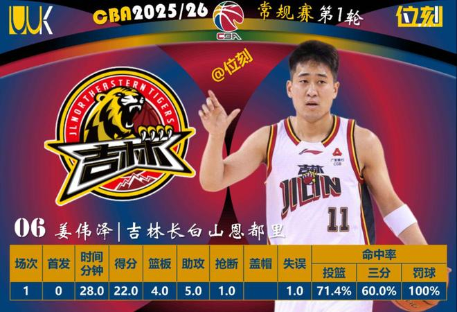 吉林的姜伟泽开局猛,前两节三分4投4中拿15分,但后两节5投0中只加2分。
