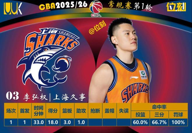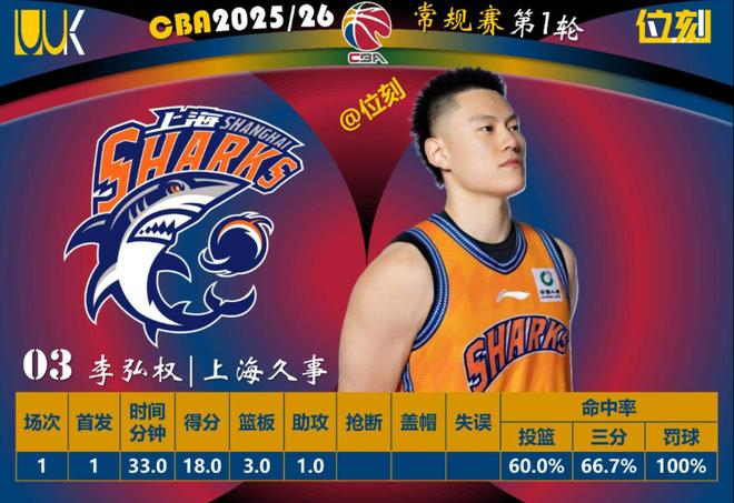 上海击败吉林,李弘权四节都有三分进账,每节投进1到2个。
