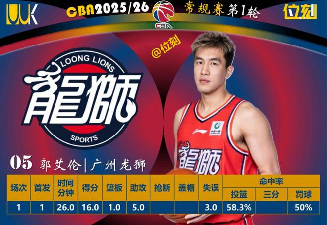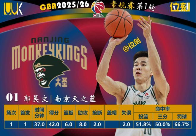 CBA新赛季首轮结束,南京客场打加时输给广东。郭昊文全场拿42分,上半场12投7中砍19分,第三节三分3连中率队反超,最后时刻两次关键出手没进还两罚不中。